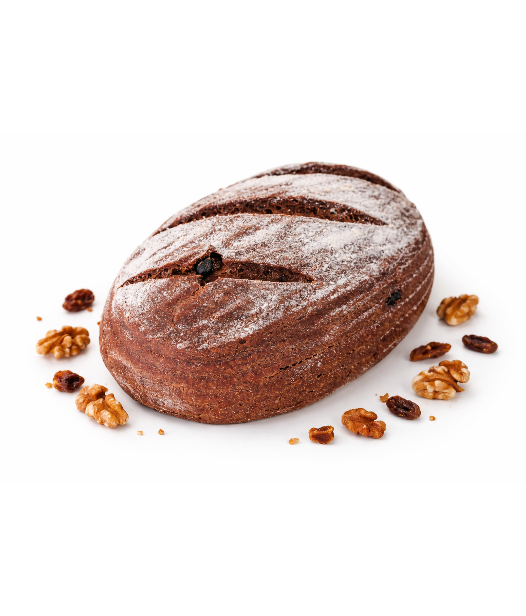 Base de harina de arroz, + masa madre y harina de algarroba, almidón de maíz y tapioca, aceite de oliva, nueces, pasas, azúcar moreno, levadura y sal.