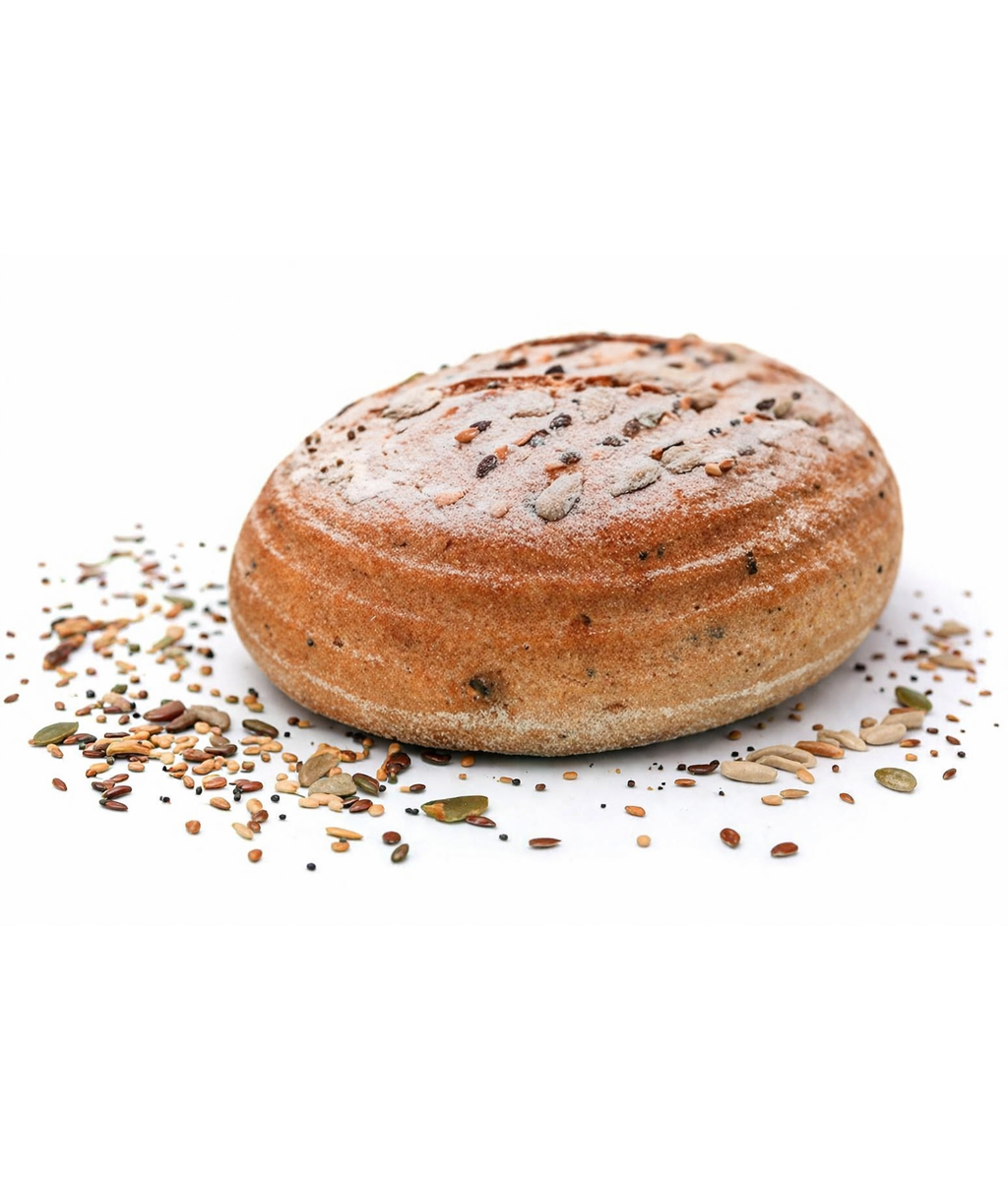 Hogaza sin gluten de masa madre con semillas en formato entera o cortada a mano en rebanadas, una delicia en cada bocado. 500 gr de pan perfectos para combinar con un sin fin de ingredientes.